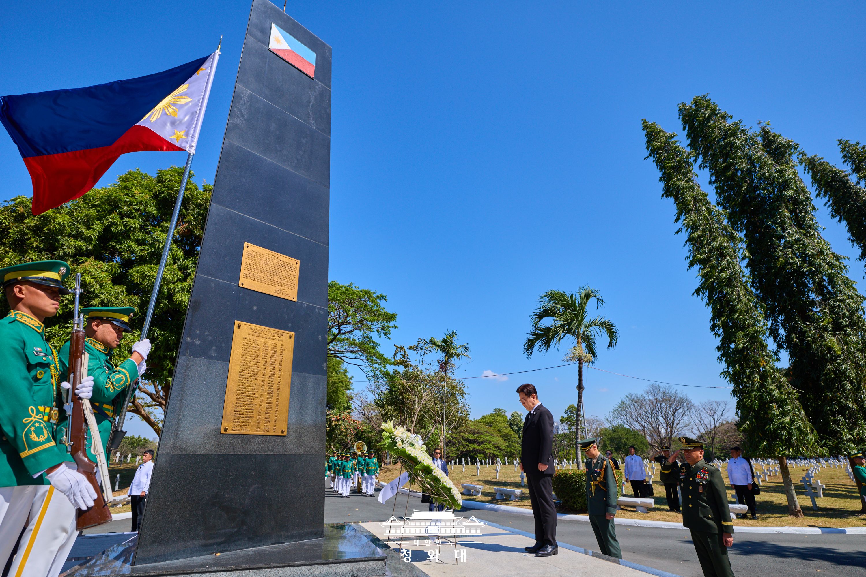이 대통령은 오늘 오전 첫 일정으로 마닐라 영웅 묘지 내 한국전 참전기념비에 헌화했습니다. 필리핀은 한국전쟁에 아시아 국가 중 최초로, 그리고 최대 규모로(7,420명) 병력을 파견해, 112명이 전사하고 300여 명이 부상을 당하거나 실종되었습니다.